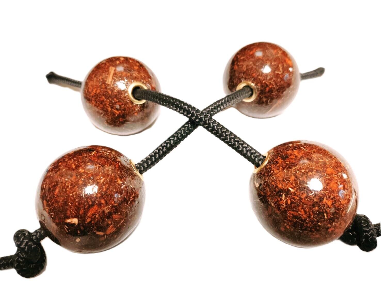 おが屑を特殊加工してオンコバスピノサ使用感を再現する共に、天然の実では難しいサイズ、形、重量を揃える事で演奏のしやすさを実現。